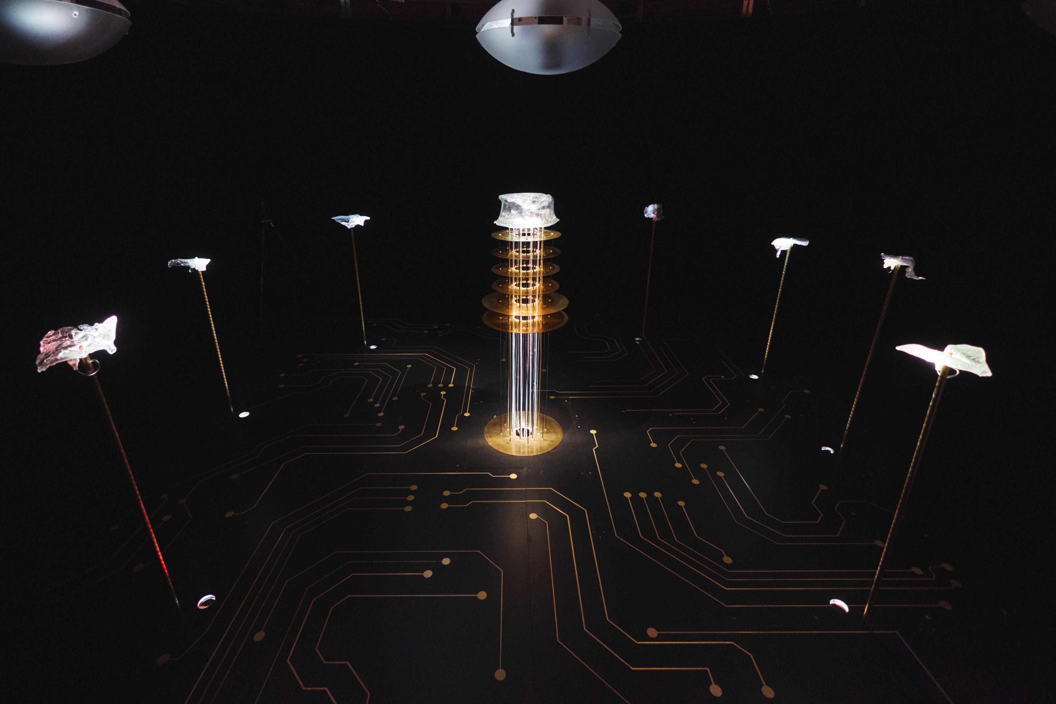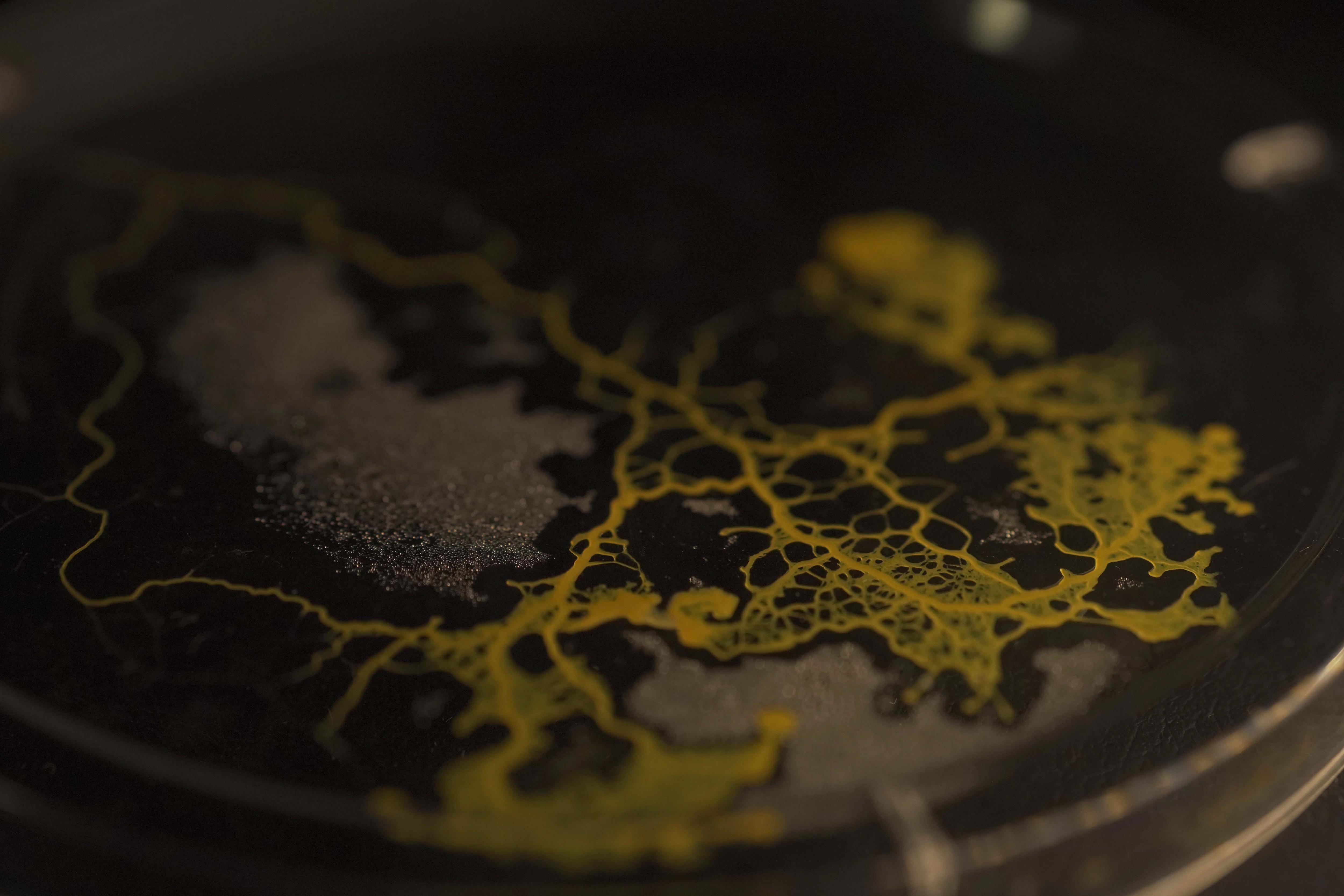 В основе инсталляции – слизевик Physarum Polycephalum, культивируемый в кастомном биореакторе с интегрированной матрицей сенсоров и системой контроля температуры и влажности. Этот одноклеточный организм способен решать задачи, прокладывать оптимальные маршруты и адаптироваться к условиям среды. Его биоэлектрическая активность считывается через сеть из 16 сенсоров и преобразуется в звук и свет в реальном времени.